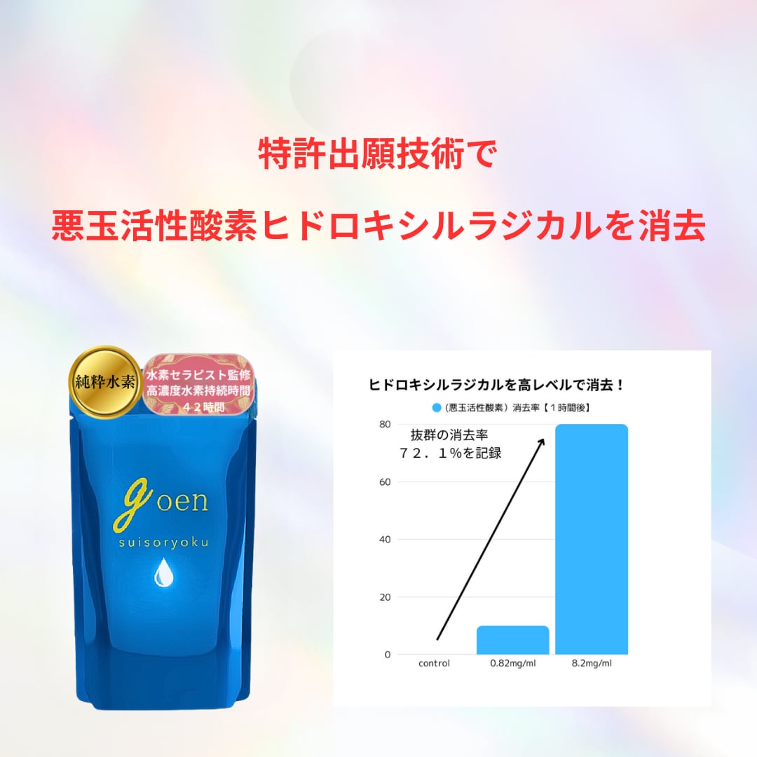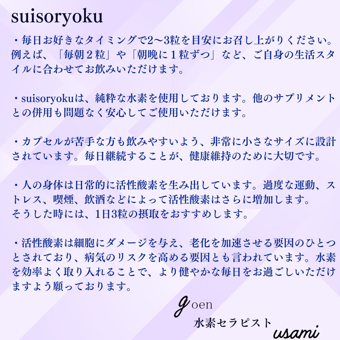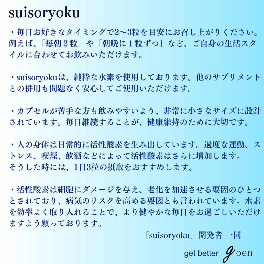 goen suisoryoku 水素サプリメントは、毎日必要な200㎎の純粋水素を手軽に補える、30日分のサプリメントです。 水素は、体内の活性酸素を除去し、健康的な生活をサポートします。このサプリメントは、手軽さと高品質を両立させており、忙しい現代人に最適です。日々のライフスタイルに簡単に取り入れられ、効果を実感できることでしょう。