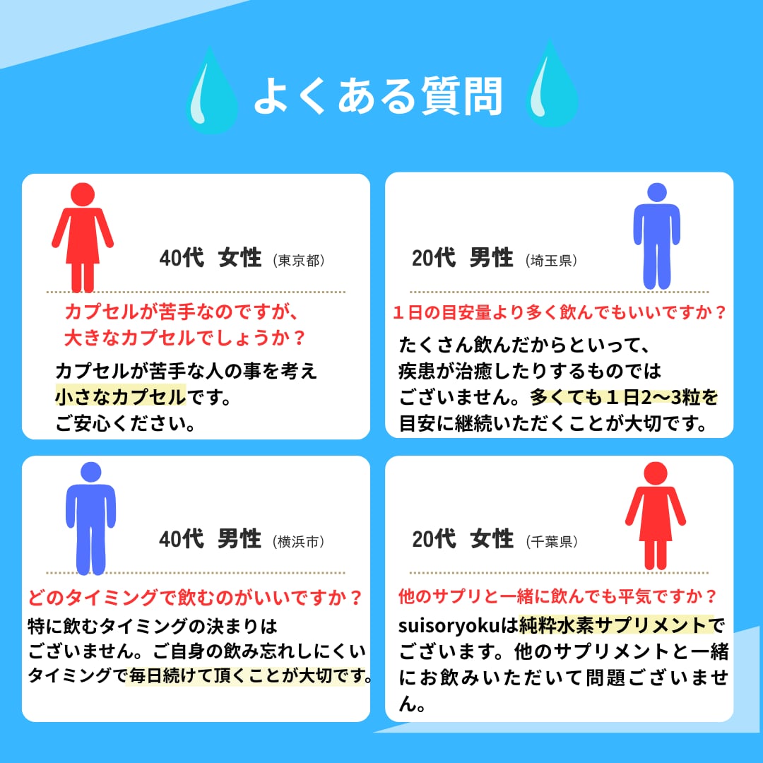 - 純粋水素、その他の成分は安全性が確認された高品質なものを使用。